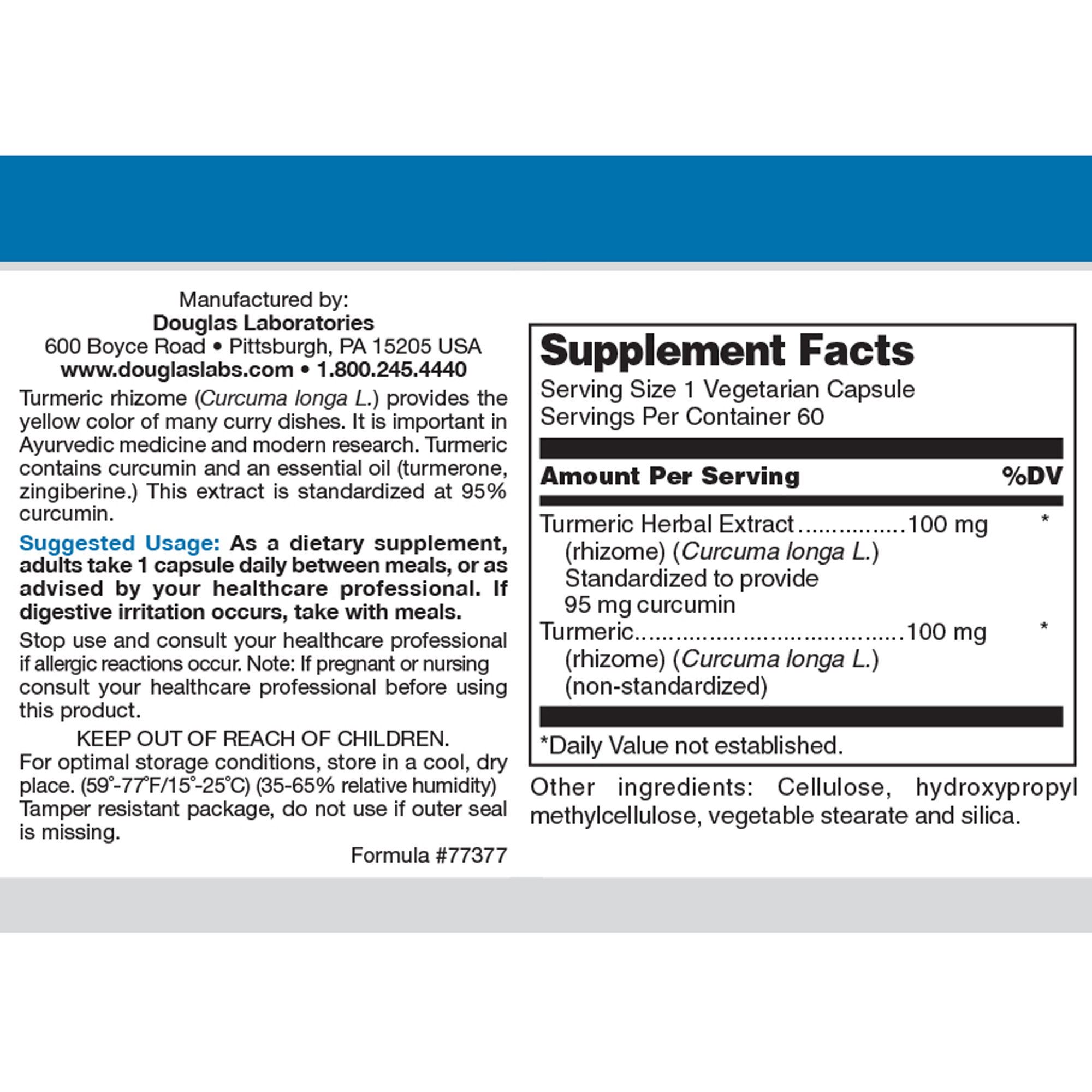 Turmeric Max-V, provided by Douglas Laboratories, supplies 100 mg of turmeric in each vegetarian capsule.
