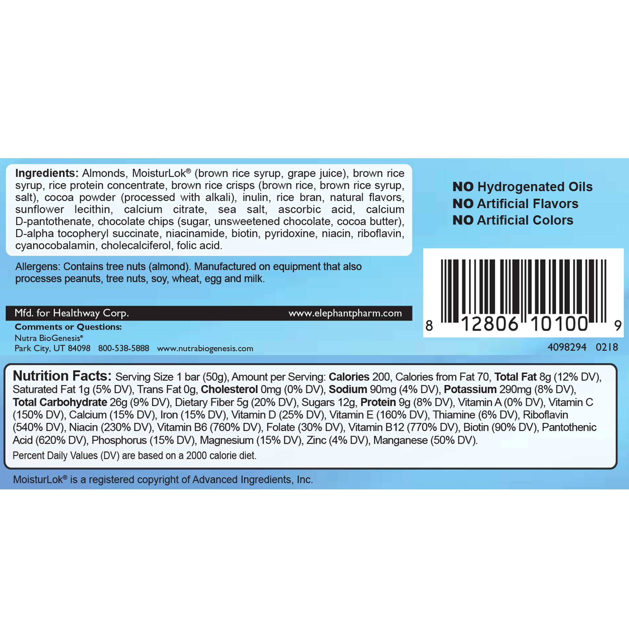 Ingredients: Almonds, MoisturLok® (brown rice syrup, grape juice), brown rice syrup, rice protein concentrate, brown rice crisps (brown rice, brown rice syrup, salt), cocoa powder (processed with alkali), inulin, rice bran, natural flavors, sunflower lecithin, calcium citrate, sea salt, ascorbic acid, calcium D-pantothenate, chocolate chips (sugar, unsweetened chocolate, cocoa butter), D-alpha tocopheryl succinate, niacinamide, biotin, pyridoxine, niacin, riboflavin, cyanocobalamin, cholecalciferol, folic acid.