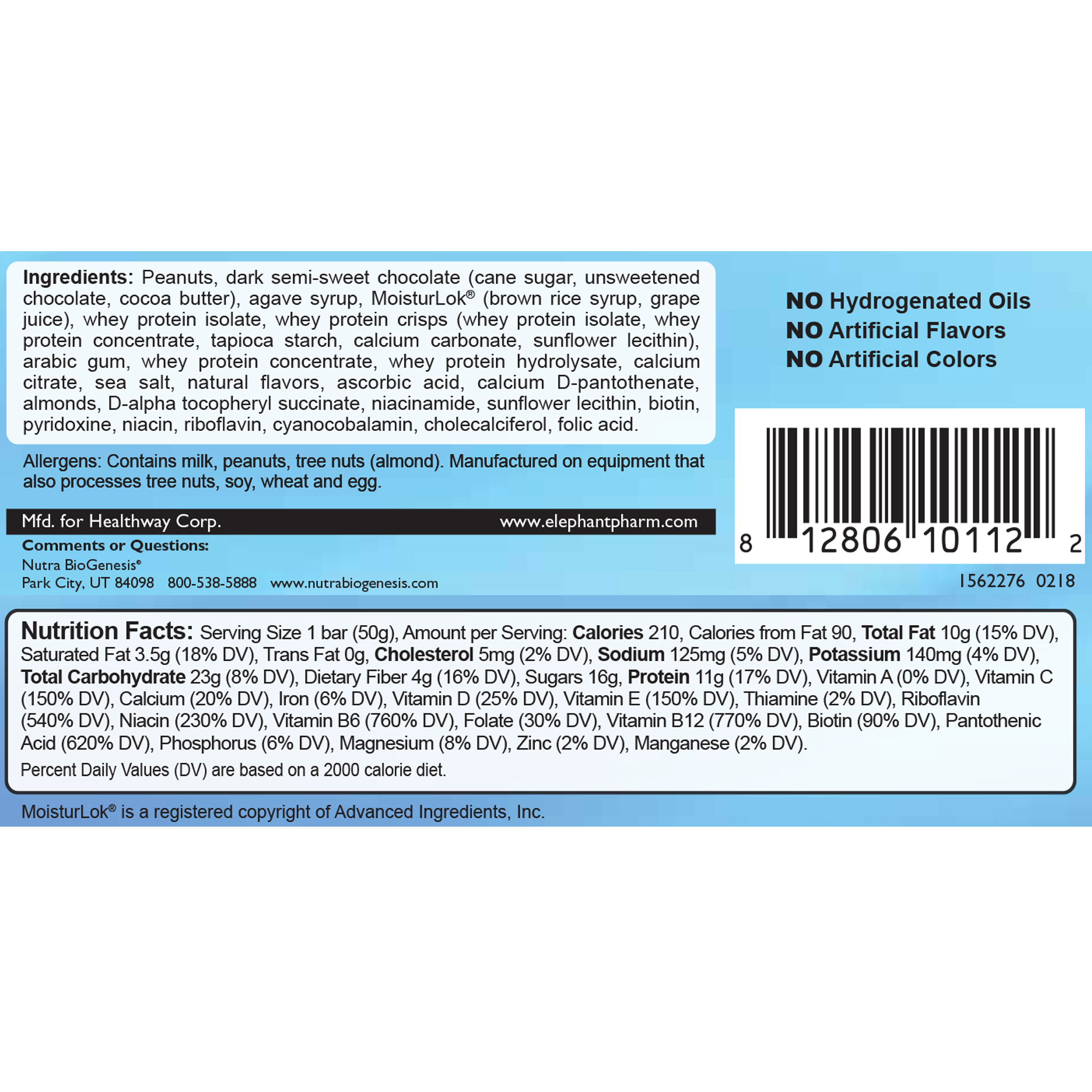 Ingredients: Peanuts, dark semi-sweet chocolate (cane sugar, unsweetened chocolate, cocoa butter), agave syrup, MoisturLok® (brown rice syrup, grape juice), whey protein isolate, whey protein crisps (whey protein isolate, whey protein concentrate, tapioca starch, calcium carbonate, sunflower lecithin), arabic gum, whey protein concentrate, whey protein hydrolysate, calcium citrate, sea salt, natural flavors, ascorbic acid, calcium D-pantothenate, almonds, D-alpha tocopheryl succinate, niacinamide, sunflower lecithin, biotin, pyridoxine, niacin, riboflavin, cyanocobalamin, cholecalciferol, folic acid.