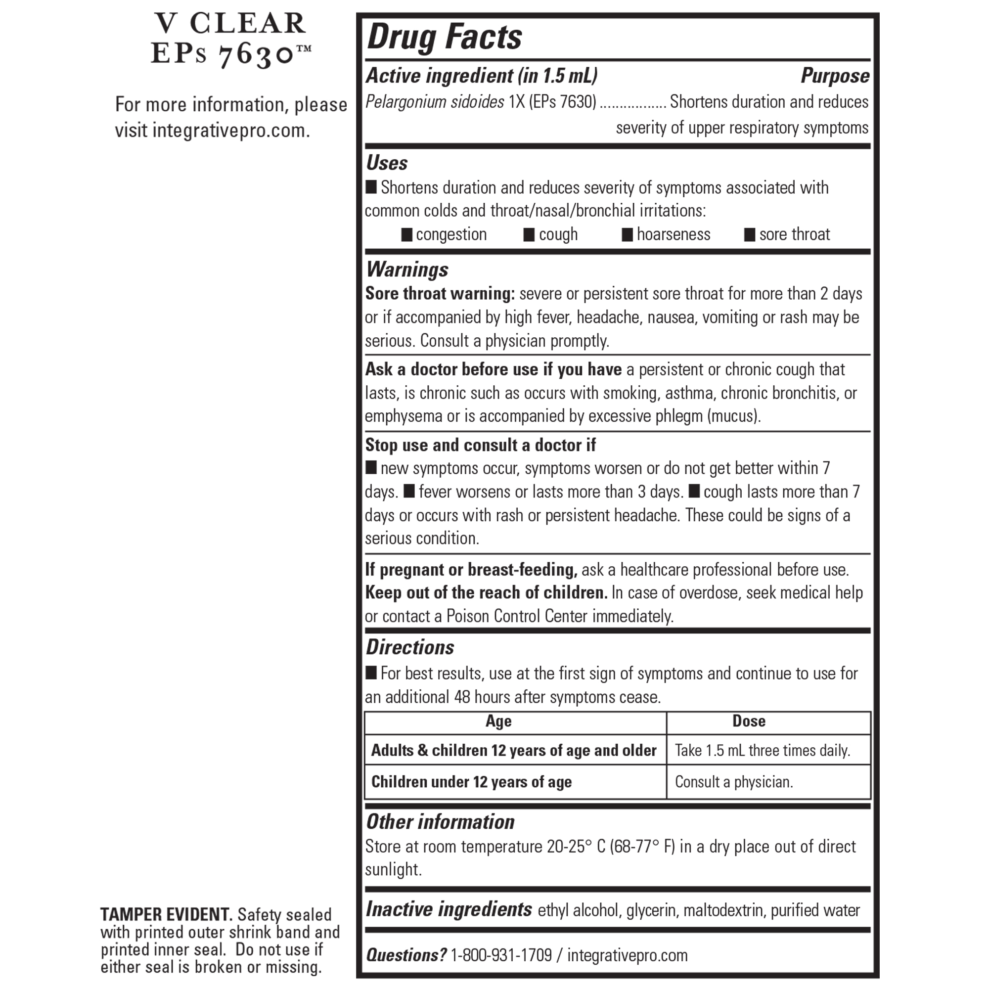 V Clear EPs 7630™ is an upper respiratory treatment containing a proprietary, homeopathic preparation of Pelargonium sidoides extract (also known as African geranium). V Clear EPs 7630 addresses the underlying cause of symptoms to help speed recovery, and shorten the duration of upper respiratory irritations.