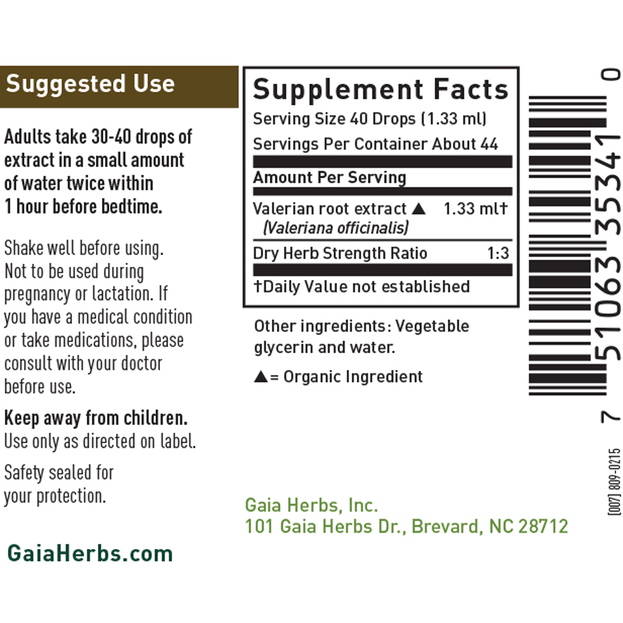 Valerian root has long been used to promote deep and restful sleep in those with occasional sleeplessness.* This Valerian Root Liquid Extract is made from Valerian grown on Gaias own certified organic farm. By restoring a sense of calm and relaxation, Valerian Root supports the body in falling asleep naturally.* In a glycerin base, Alcohol Free Valerian Root tastes great!