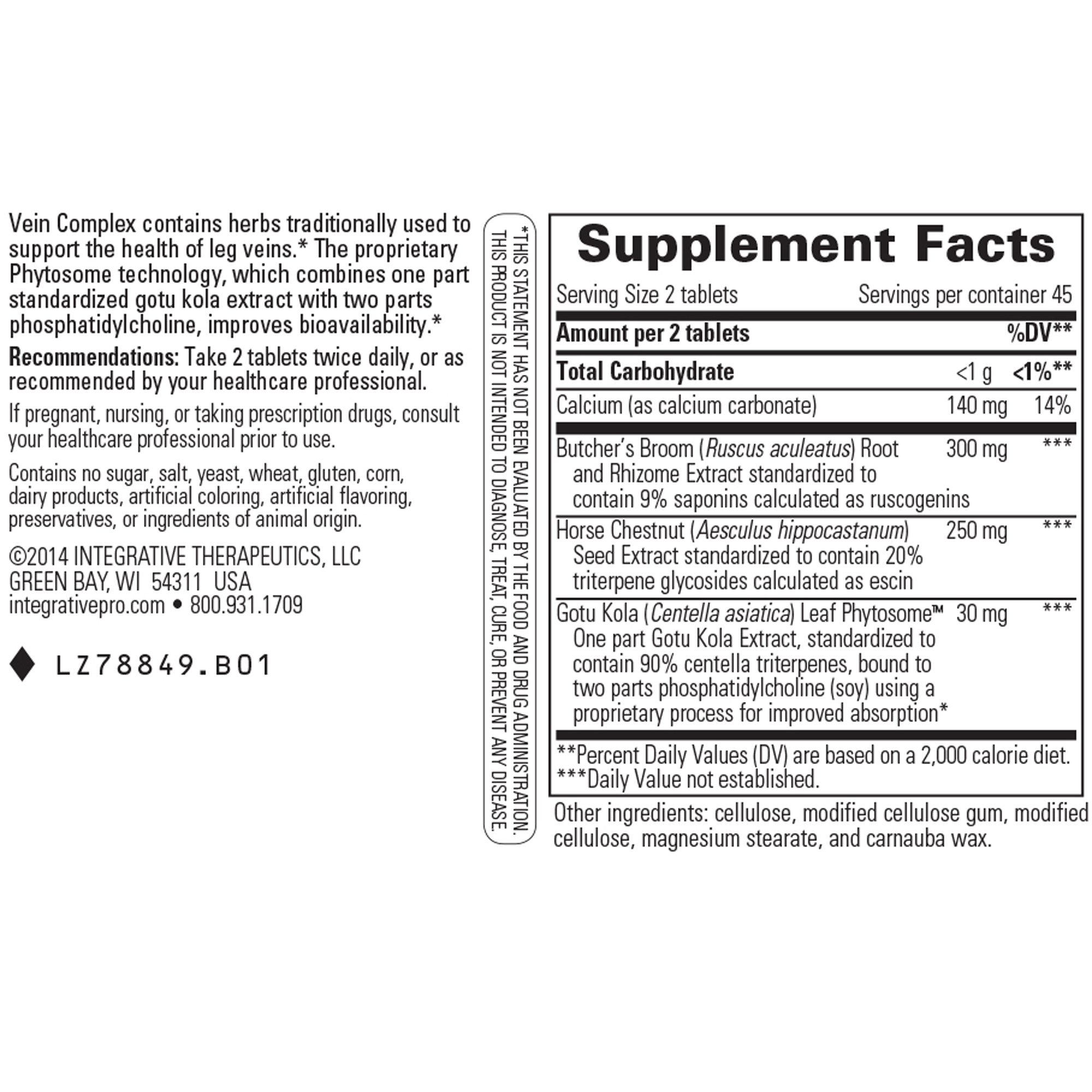 Vein Complex is an herbal formula to support proper circulation and healthy veins in the legs.*The proprietary Phytosome technology, which combines one part standardized gotu kola extract with two parts phosphatidylcholine, dramatically improves bioavailability.*
