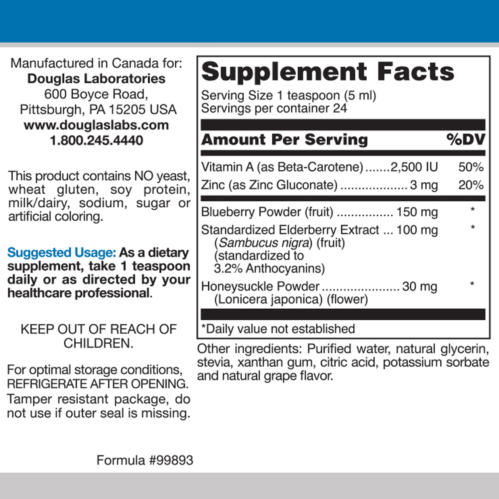 FUNCTIONS Free radicals are unstable compounds formed in the body during metabolism and from exposure to environmental sources such as pollution and cigarette smoke. Free radicals are necessary for energy metabolism and immune function, but when an excessive number of free radicals are formed, they can attack healthy cells, especially their membrane lipids and proteins. This, in turn, is thought to affect a number of body processes, including optimal functioning of the immune system. Beta-carotene is an important antioxidant nutrient that protects healthy cells from oxidative and free radical damage. Numerous studies have demonstrated the importance of beta-carotene for normal immune function. The immune benefits of betacarotene are due to its vitamin A precursor role and its antioxidant functions. Zinc is an essential trace element involved in most major metabolic pathways. General signs of human zinc deficiency indicate that zinc has important functions in maintaining immune function, reproduction, healthy skin, and growth. Numerous studies support the fundamental role of zinc in normal immune response in humans. Immune cells must be able to rapidly divide in order to respond to daily challenges. Like all rapidly dividing cells, immune cells depend on adequate amounts of dietary zinc. Blueberries contain a powerful class of antioxidants known as proanthocyanidins. Proanthocyanidins are among the most powerful natural free-radical scavengers yet discovered. As such, proanthocyanidins have their own unique place in the body’s overall protection against harmful free radical damage. Healthy immune function can also be maintained by supporting a well balanced production of cytokines. Studies using elderberry have indicated that it may have effective immuno-protective abilities, including supporting a balanced production of cytokines. Honeysuckle has also been reported for its immuno-protective properties.