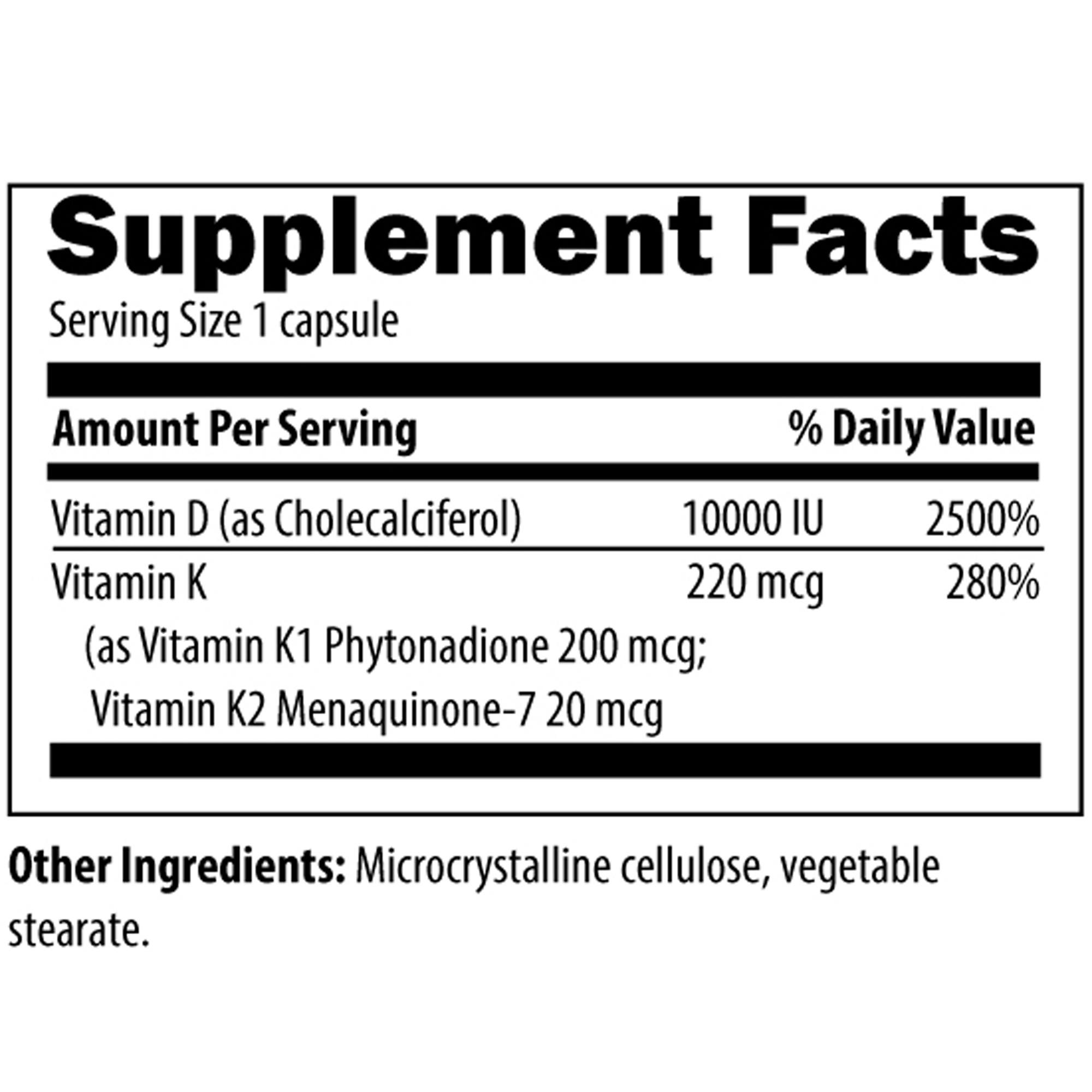Vitamin D Ultra 10K also includes vitamin K in both K1 and the MK-7 form of K2, which is highly bioavailable. Both of these forms of vitamin K are important to our health: vitamin K1 (the naturally occurring form of vitamin K in vegetables) and vitamin K2 as MK-7, which is a product of soy fermentation (free of soy allergens) and has the special property of metabolizing slowly throughout the day. Vitamins D and K are essential for optimal bone and arterial health and for maintaining the immune system in proper balance.