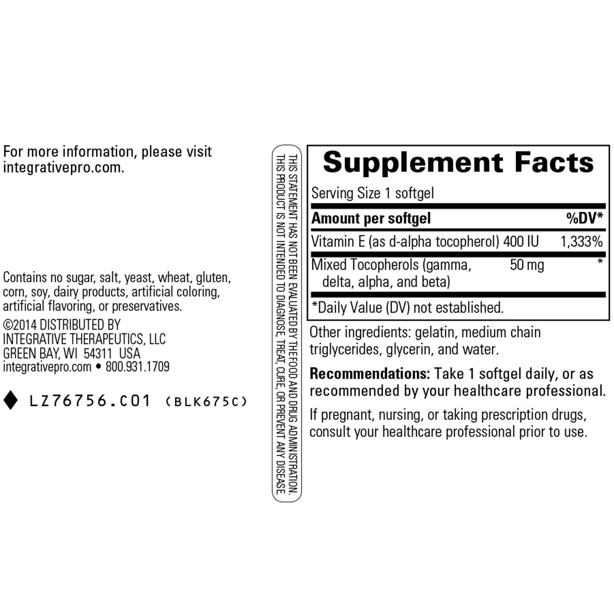 The vitamin E family is made up of different compounds called tocopherols including alpha, gamma, beta, and delta. These components work together and must all be present to be optimally utilized by the body. Our Vitamin E formula was developed to provide the full range of tocopherols necessary to support cardiovascular health.*