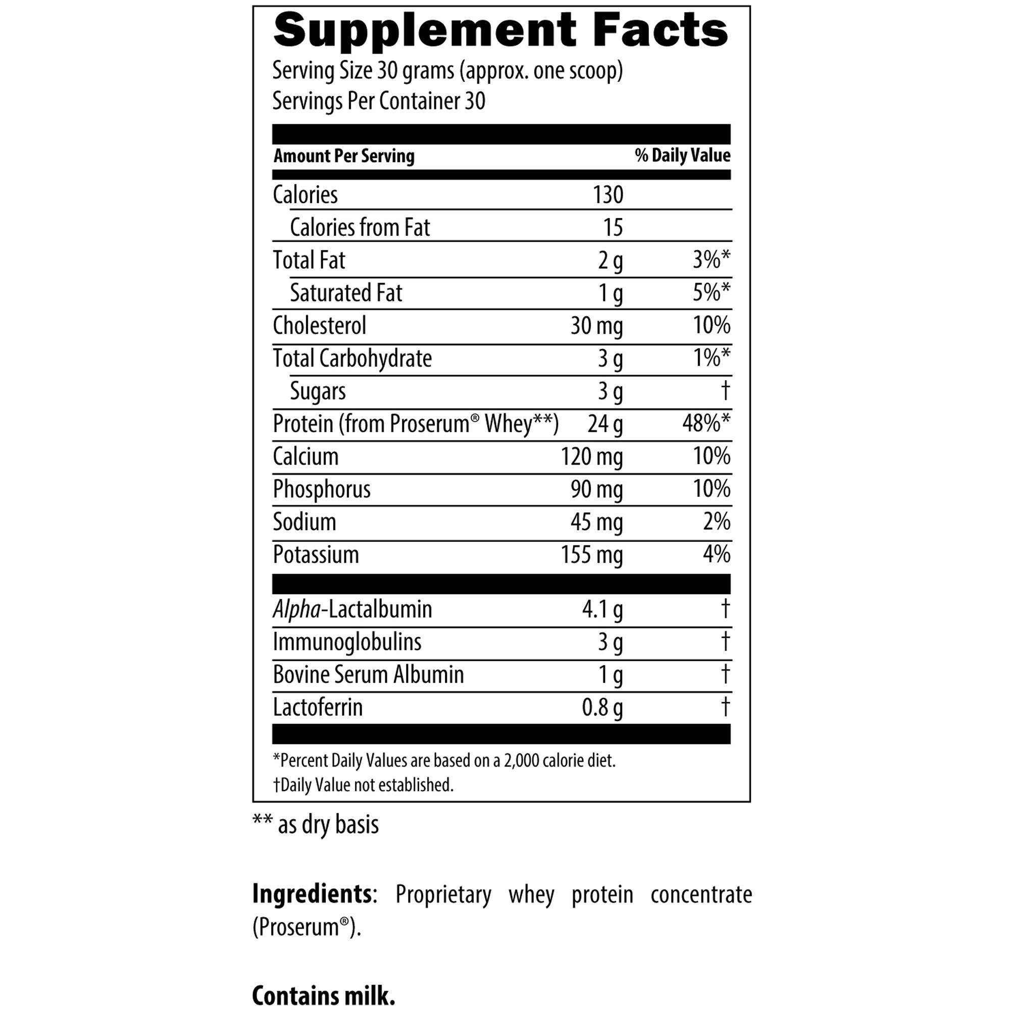 Other Ingredients: Proprietary whey protein concentrate (Proserum®).