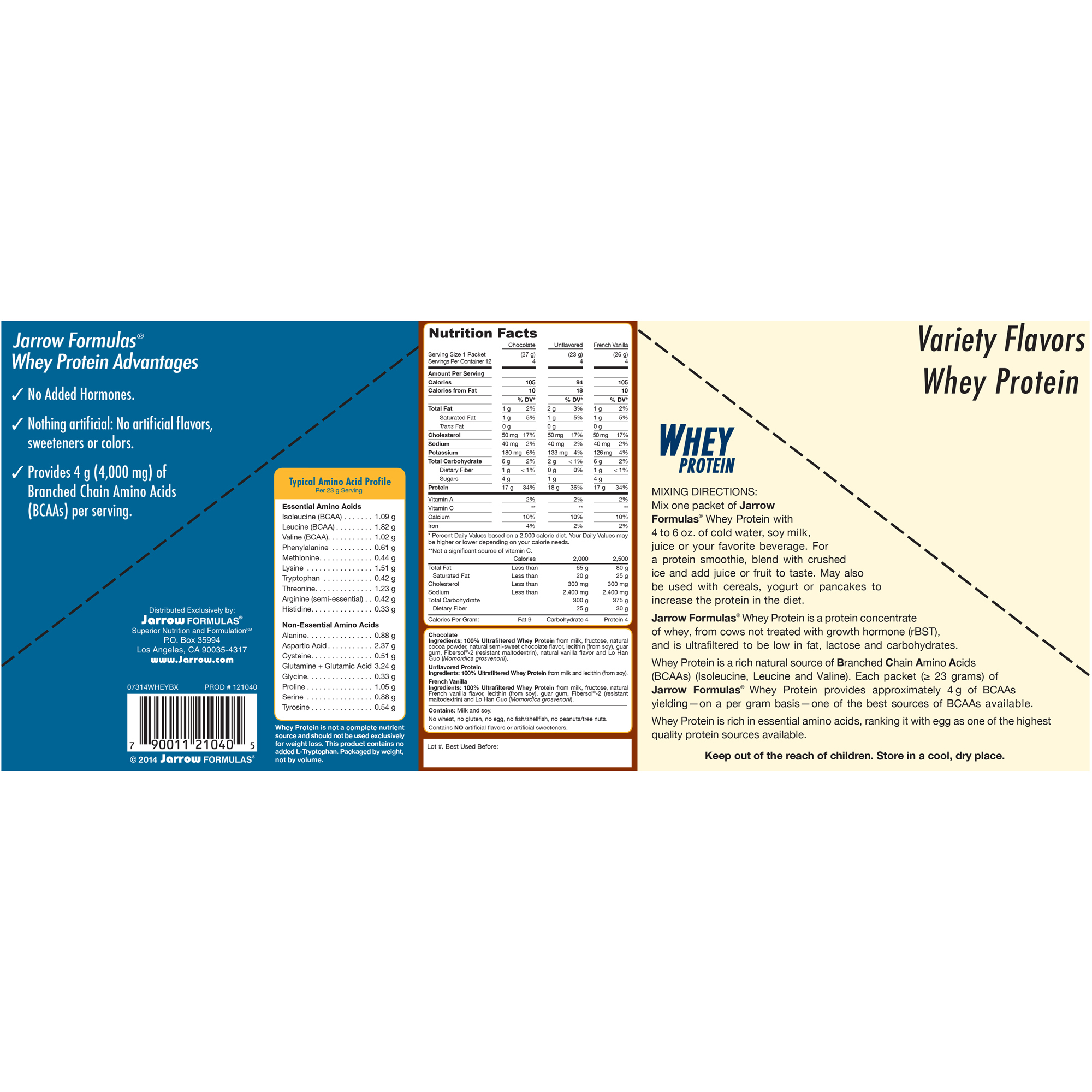 Whey Protein is a rich natural source of Branched Chain Amino Acids (BCAAs) (Isoleucine, Leucine and Valine). Each packet (= 23 grams) of Jarrow Formulas® Whey Protein provides approximately 4 g of BCAAs yielding—on a per gram basis—one of the best sources of BCAAs available.